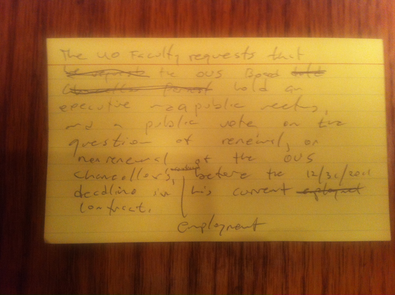 Image of the handwritten motion for review of OUS Chancellor Pernsteiner's contract. It was the fourth motion of the November 30, 2011 statutory faculty assembly held in response to President Richard Lariviere's dismissal. Motion passed by unanimous voice vote.