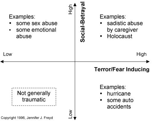 Freyd, J.J. (2003). What is a Betrayal Trauma? What is Betrayal Trauma Theory? Retrieved Aug 10, 2003 from http://dynamic.uoregon.edu/~jjf/defineBT.html.